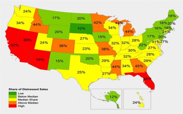 This week, NAR released an Economic Outlook. In the report, they covered the percentage of overall sales that distressed properties represented in each state. Here is a map that accompanied the report: