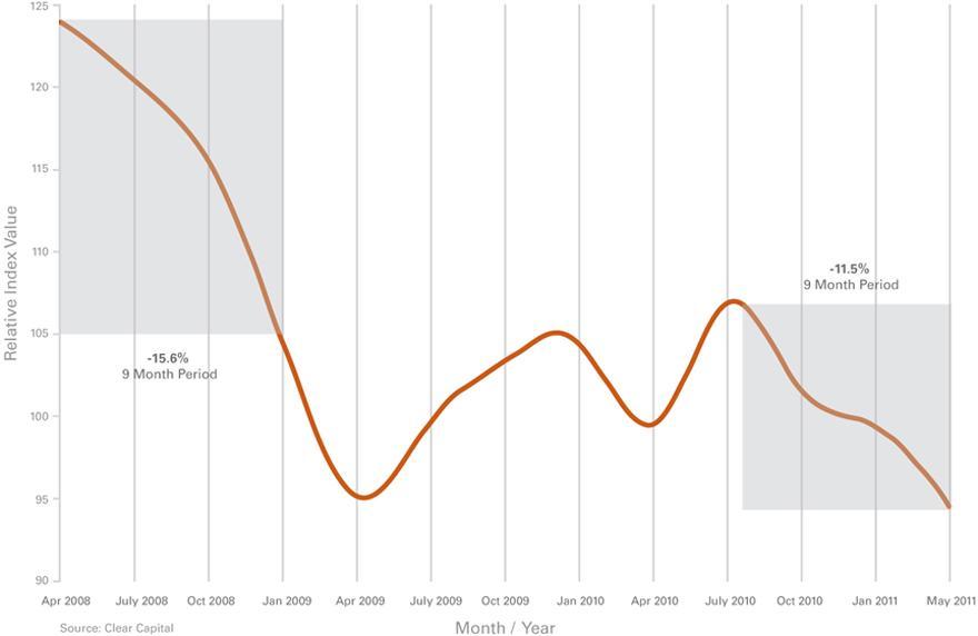 Clear Capital discussed this point in their May 2011 Market Report. In the report they used two graphs to emphasize the connection. In the first graph, they charted the national saturation rate of foreclosures (REOs) from 2008 until the present.