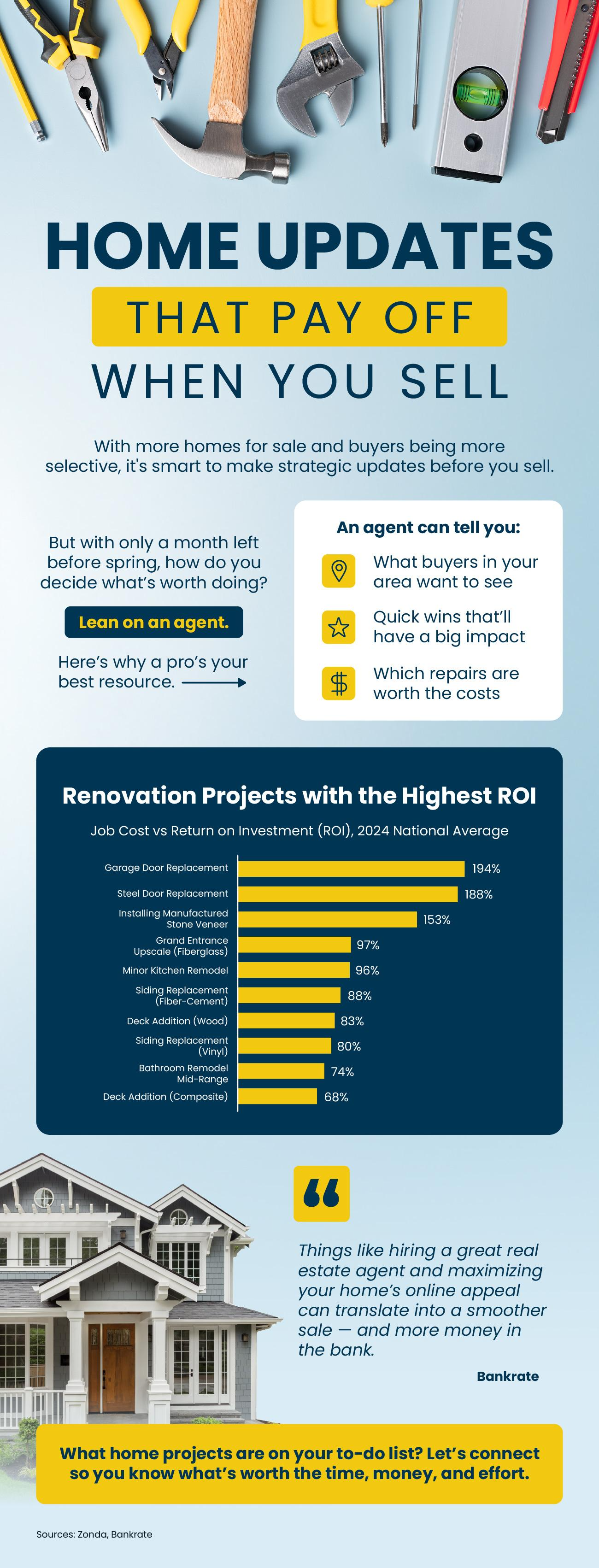 With more homes for sale and buyers being more selective, it’s smart to make strategic updates. But how do you decide what’s worth doing? You lean on an agent. An agent will be able to tell you what buyers want, quick wins that’ll have a big impact, and what projects have the best ROI. What projects are on your to-do list before selling? With only a month left before spring, let’s connect so you know what’s worth the time and effort.
