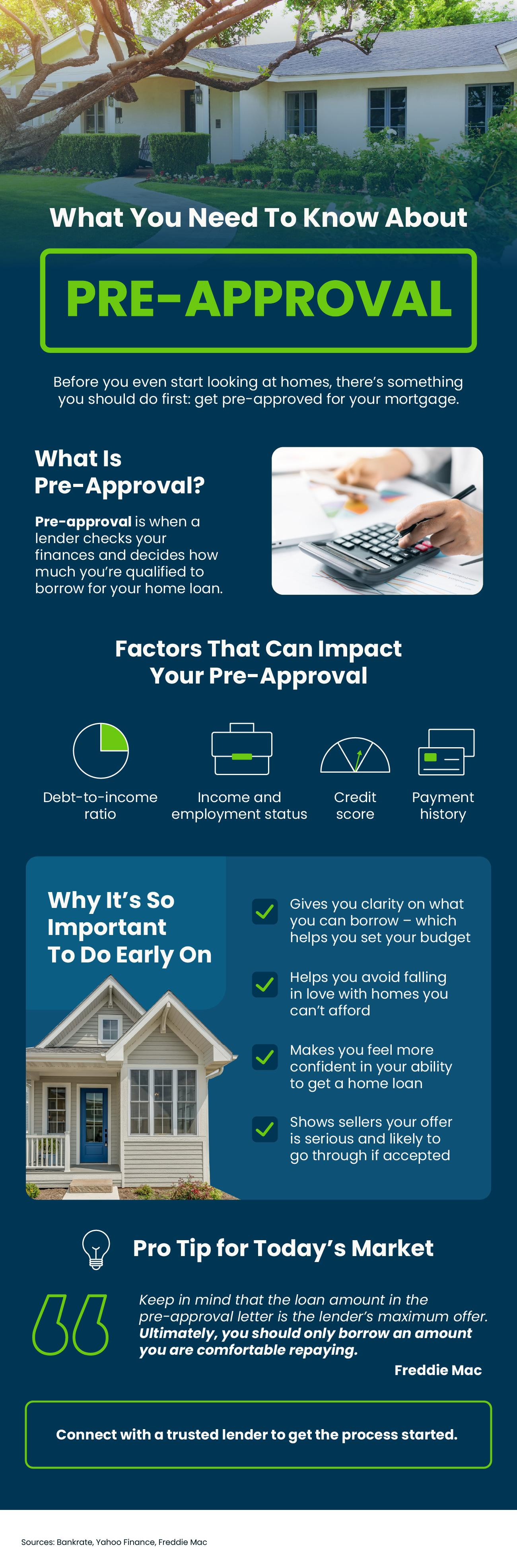 Before you even start looking at homes, there’s something you should do first – and that’s get pre-approved for your mortgage. Pre-approval is when a lender checks your finances and decides how much you’re qualified to borrow for your home loan. This helps you determine your budget and makes your offer stand out for sellers. Connect with a trusted lender to get the process started.